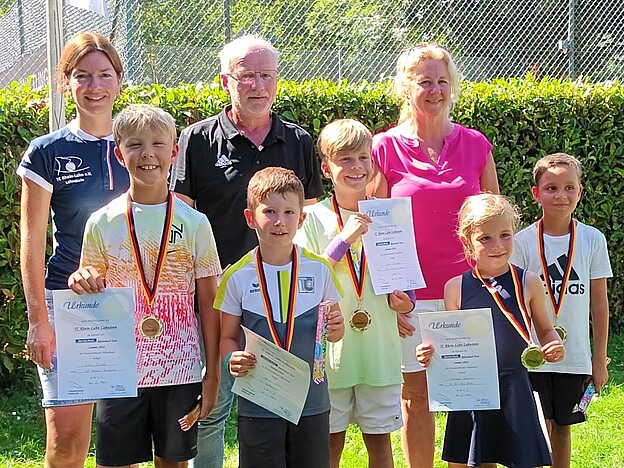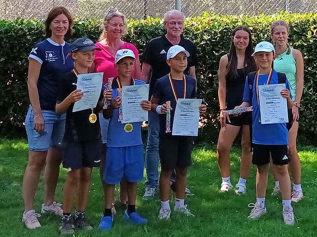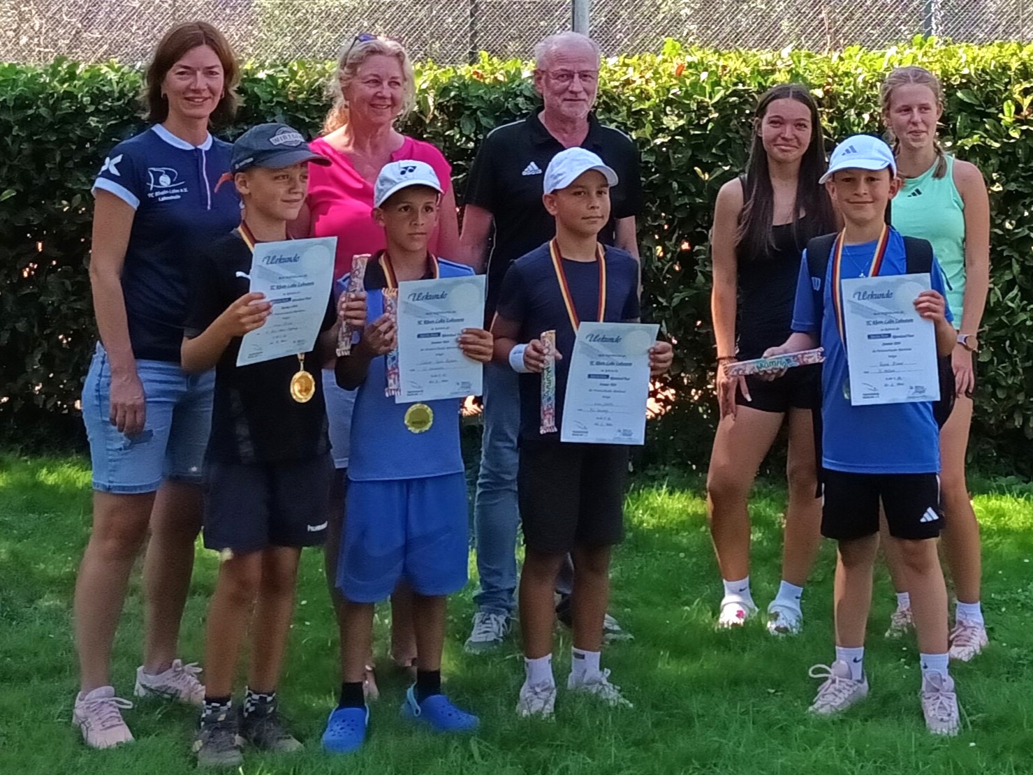 Am letzten Ferienwochenende fand auf der Anlage des TC Rhein-Lahn Lahnstein zum dritten Mal das Midfeld-Turnier im Rahmen der Sparda-Bank Rheinland-Tour statt. Insgesamt neun Mädchen und Jungen haben sich angemeldet, sodass zwei Konkurrenzen, eine Gemischte U9- und eine Jungen U10-Konkurrenz, stattfinden konnten. Auf vier Plätzen spielte jeder gegen jeden im sogenannten Midfeld mit druckreduzierten (orangenen) Bällen. Ziel war es, je nach Konkurrenz ein oder zwei verkürzte Sätze ab dem Spielstand von 2:2 zu gewinnen. Alle Spiele liefen bei heißen Temperaturen äußerst fair und freundschaftlich ab, sodass die Schiedsrichterinnen und Schiedsrichter einen ruhigen Job hatten und die Turnierleitung bei der Siegerehrung ausschließlich in strahlende Gesichter schaute. Ein besonderer Dank gilt dem Tennisverband Rheinland und dessen Jugendwartin Sandra Beyl für die Organisation und die Unterstützung im Vorfeld des Midfeldturniers.