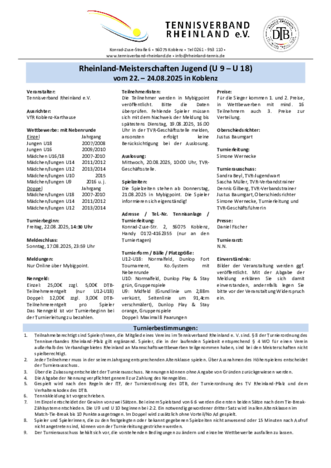 Die Rheinlandmeisterschaften der Jugend des Tennisverbandes Rheinland Freiplatz finden vom 22.08. – 24.08.2025 beim VfR Koblenz-Karthause statt. Ausgeschrieben sind die Altersklassen U 18 bis U 9. Meldeschluss ist am Sonntag, 17.08.2025, 23:59 Uhr. Jeder Teilnehmer hat mindestens zwei Spiele (Gruppenspiele oder Nebenrunde).