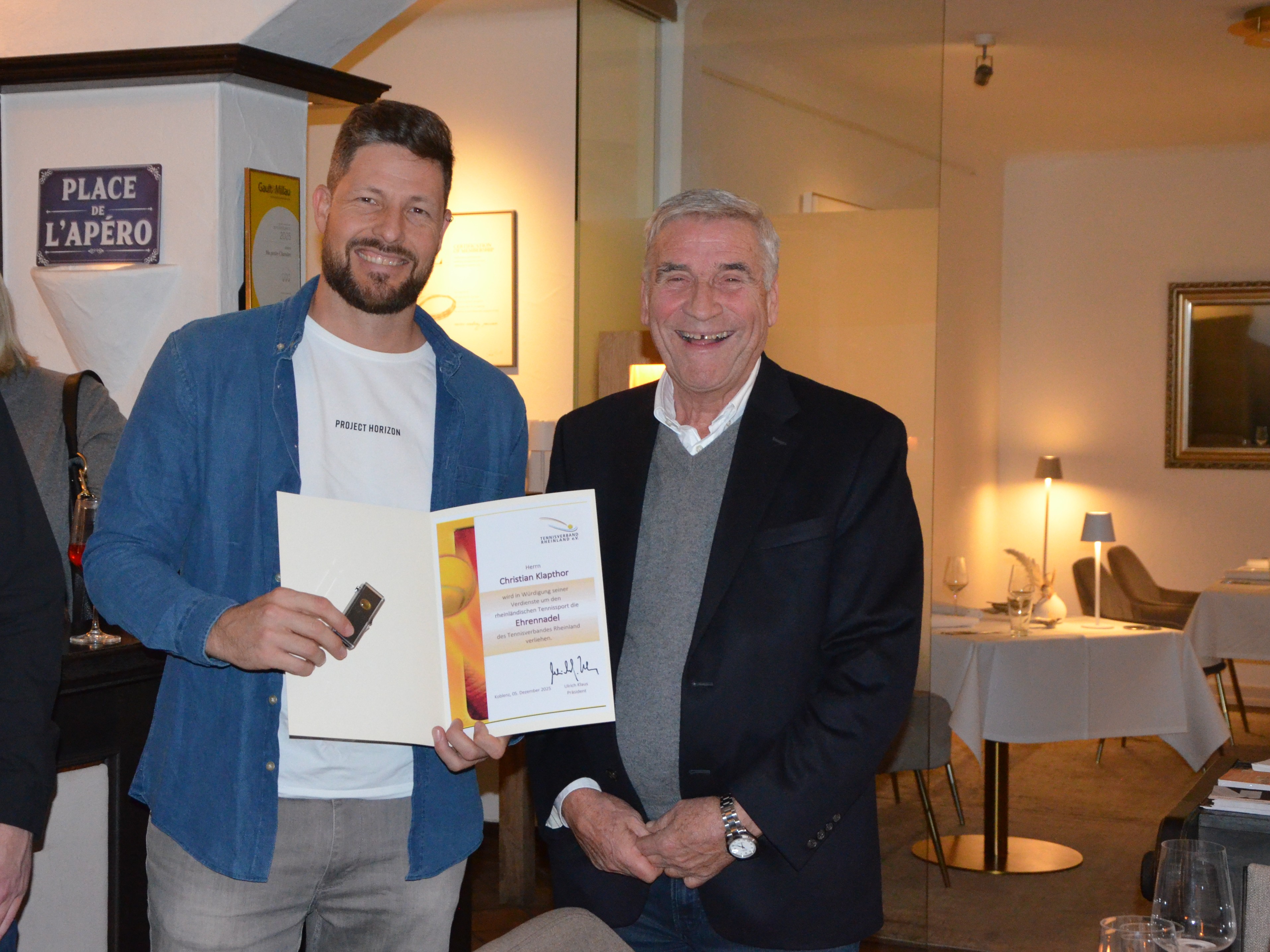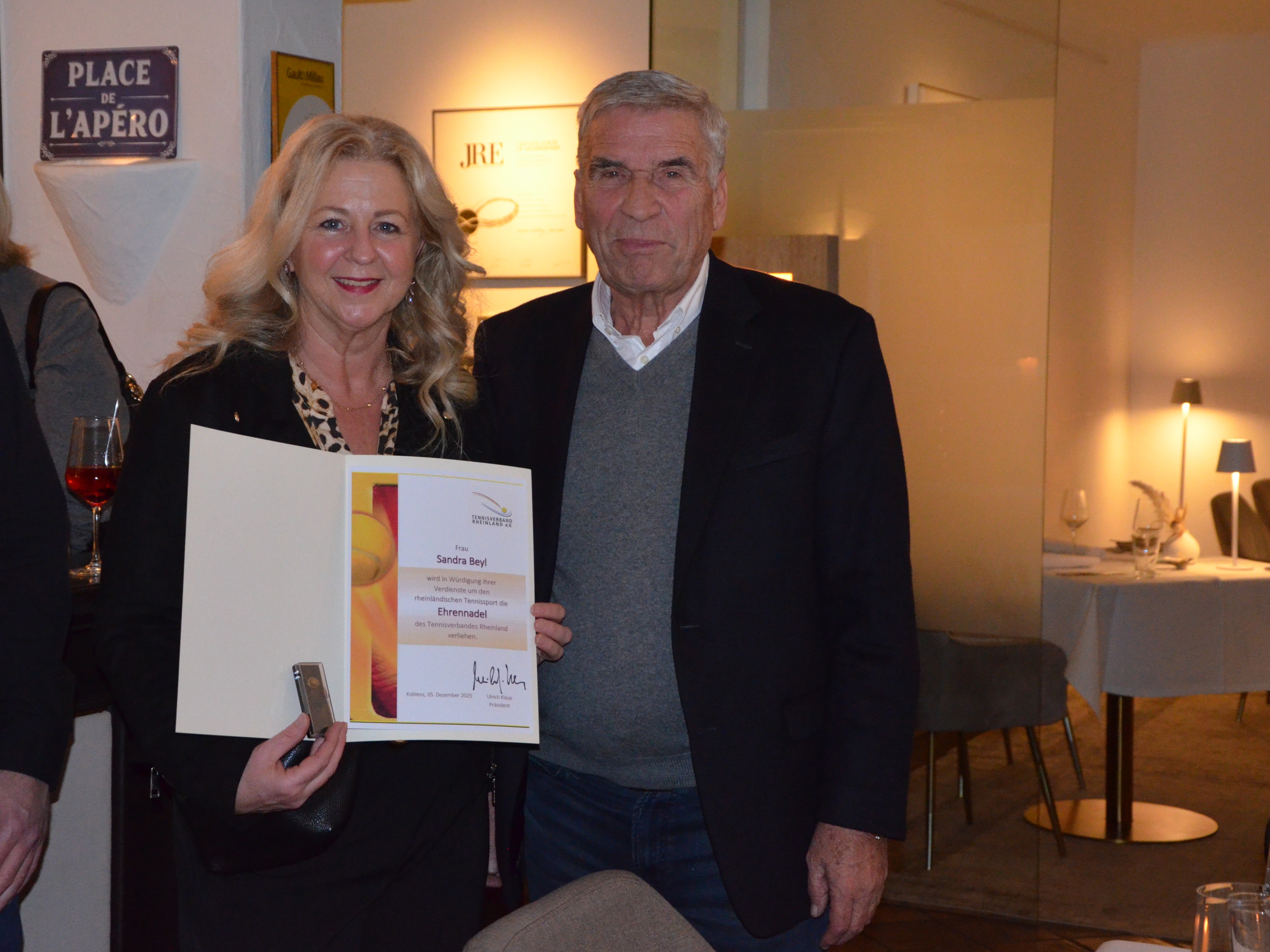 Anlässlich der Jahresabschlussversammlung des Tennisverbandes Rheinland wurden Jugendwartin Sandra Beyl und Sportwart Christian Klapthor mit der Bronzenen Ehrennadel des Verbandes ausgezeichnet.