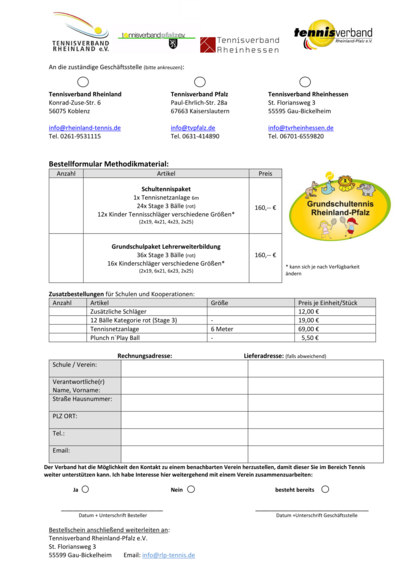 Der Tennisverband-Rheinland-Pfalz stellt für Grundschulen bzw. kooperierende Vereine subventionierte Materialpakete zur Verfügung.